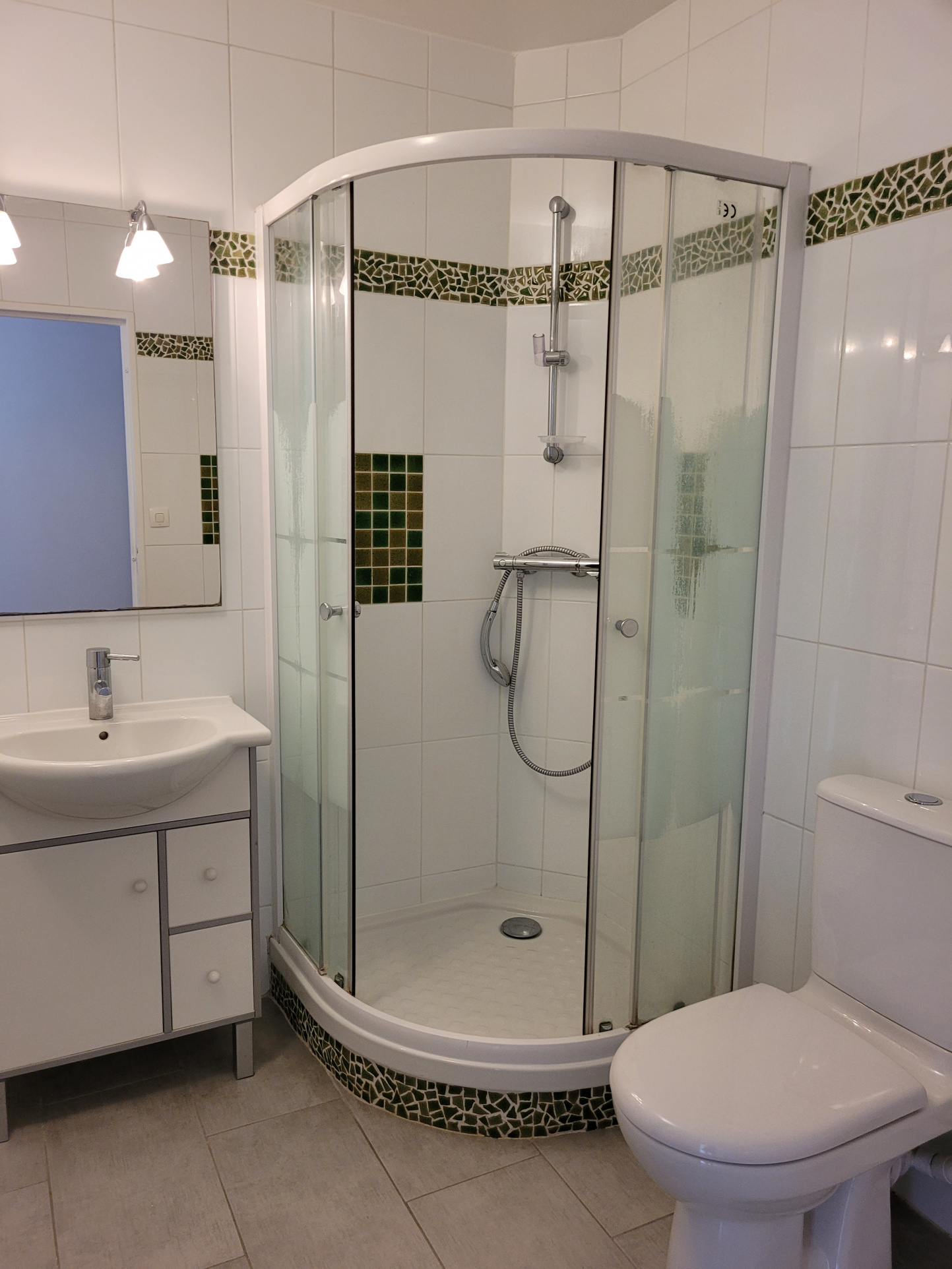 GRAND STUDIO DE 35 m2 avec un parking extérieur. un couloir, une pièce principale, cuisie meublée et équipée, salle de douche avec wc et un cellier.